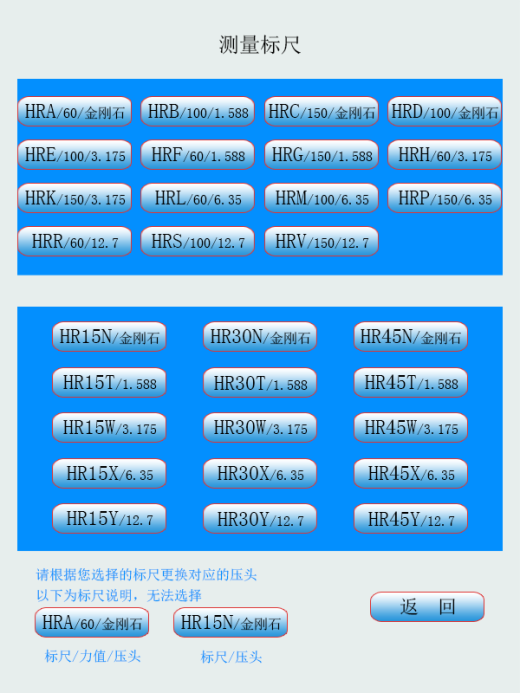 HRA:20-88、HRB:20-100、HRC:20-70、HRD:40-77、HRE:70-100、 HRF:60-100 HRG:30-94、HRH:80-100、HRK:40-100、HRL:50-115、 HRM:85-115、HRR:114-125 |